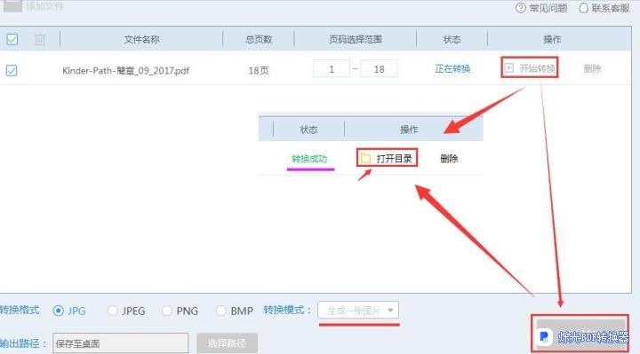 3,添加pdf文件之后,选择需要转换的页码,并设置转换格式和输出路径。软件左下角转换格式选择有jpg、jpeg、png、bmp等4种格式,转换模式可选择生成多张图片或生成一张图片,根据自己的需要并设置保存的路径【默认路径为桌面】。设置完成之后就可以直接点击右下角“开始转换”按钮进行文件转换。