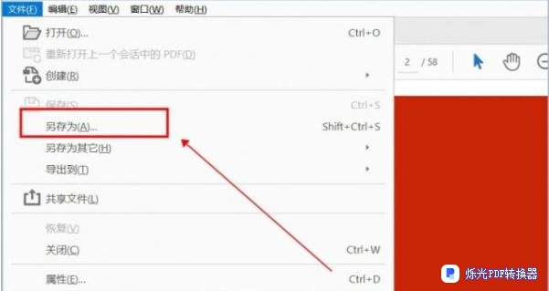 我们使用另存为法来解决pdf转word。我们在打开一份pdf文件够,点击pdf上方的“文件”选择其中的“另存为”功能。
